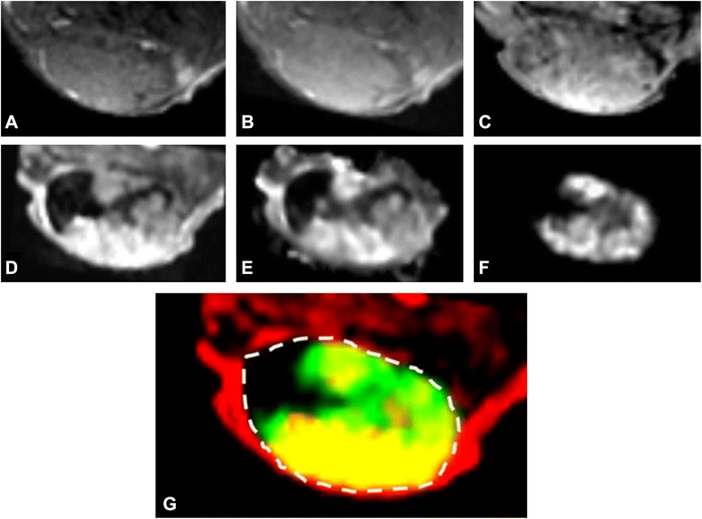 Fig. Example of MRI and SPECT images and DCE-MRI parameters of a single tumor slice. a T1-weighted MRI. b T2-weighted MRI. c T2*-weightedMRI. d Area under the curve for the first 60 s (AUC60). e Ktrans. f SPECT radiopeptide uptake. g Overlap (yellow) between AUC60 (red) and SPECT (green)within the tumor boundary (dotted line).