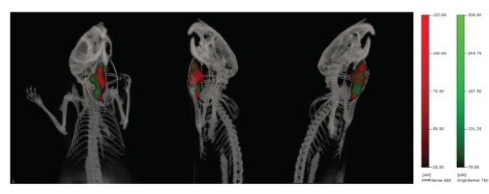 Fig. Effect of HBOT on tumor vasculature. Multimodal FMT/CT imaging of a FaDu-luc mouse 24 h after injection of MMPSense680 (red) and AngioSense750 (green) to detect tumor margins and region of tumor vascular leak, respectively.