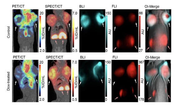 Fig. Representative four-modality imaging on non-treated (Control) or doxorubicin-treated (Dox-treated) MCF7-Luc2 tumor-bearing mice. Representative coronal [18F]FDG-PET/CT and [111In]3-SPECT/CT images, followed by bioluminescence (BLI) and fluorescence (FLI) images and an overlay of the two optical imaging modalities (OI-Merge). The white arrows indicate locations of tumors and the red arrows indicate locations of kidneys.